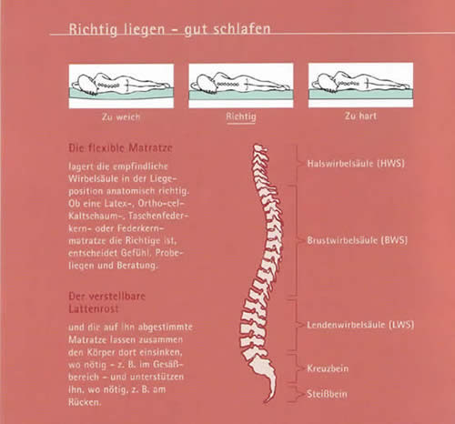 Richtig Liegen - gut schlafen Ein Drittel seiner Zeit verbringt der Mensch im Bett und mit Schlafen. Man möchte nicht glauben, wie nebensächlich dieser Bereich behandelt wird. Dieses Unwissen verursacht in zunehmendem Masse Allergien, Rheumatismen und krankhafte Veränderungen der Wirbelsäule und des Beckens - ein groser Teil unserer primären Volkskrankenheiten.