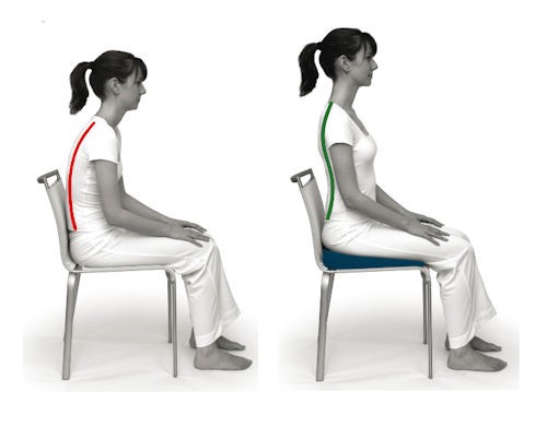 Wir sitzen sehr viel. Vor allem bei der Arbeit. Da ist eine korrekte Sitzhaltung besonders wichtig, weil wir immerhin bis 8 Stunden am Tag in dieser Position verbringen. Das ist eine Belastung für der Rücken. Er passt sich der Fehlhaltung an und so entwickeln sich schnell Rückenbeschwerden. Um dem entgegenzuwirken können Sie sich selber am ehesten helfen, indem Sie sich eine korrekte Sitzhaltung angewöhnen. Sitzen Sie gerade, beide Beine parallen zueinander. Achten Sie darauf, dass Sie nicht ineinander "zusammensacken" (Bild links), sondern den Rücken gerade halten. Um in der aufrechten Haltung zu bleiben hilft oft ein Keil (Bild rechts).